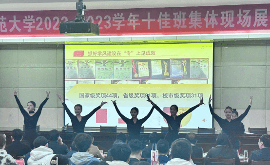 外国语学院英语专业2021级8班在展示中以中英文双语的形式向全场展示了班级风采。在学习方面,该班英语四级一次性通过率100%,高于全国30%,英语六级平均分528分、专四一次性通过率85%、班级获奖高达85余项……他们通过与众不同的展示,呈现出班级全体成员努力取得的优异成果,赢得了现场老师和学生们的阵阵掌声。