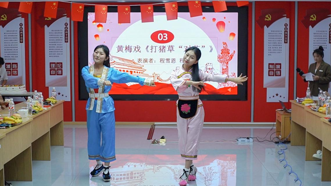 “郎对花,姐对花,一对对到田埂下……”菱湖校区的双胞胎姐妹、表演(黄梅戏表演方向)专业2024级程雪恩和表演(黄梅戏表演方向)专业2025级程雪慈身着传统戏服,一唱一和,将黄梅戏《打猪草》“对花”选段演绎得婉转俏皮,把安庆地方文化的独特魅力展现得淋漓尽致。“原来传统戏曲这么有韵味!”来自物流管理专业国际班的越南留学生芳英好奇地向身边朋友询问唱段的典故,在文化碰撞中感受中华文化的深厚底蕴。