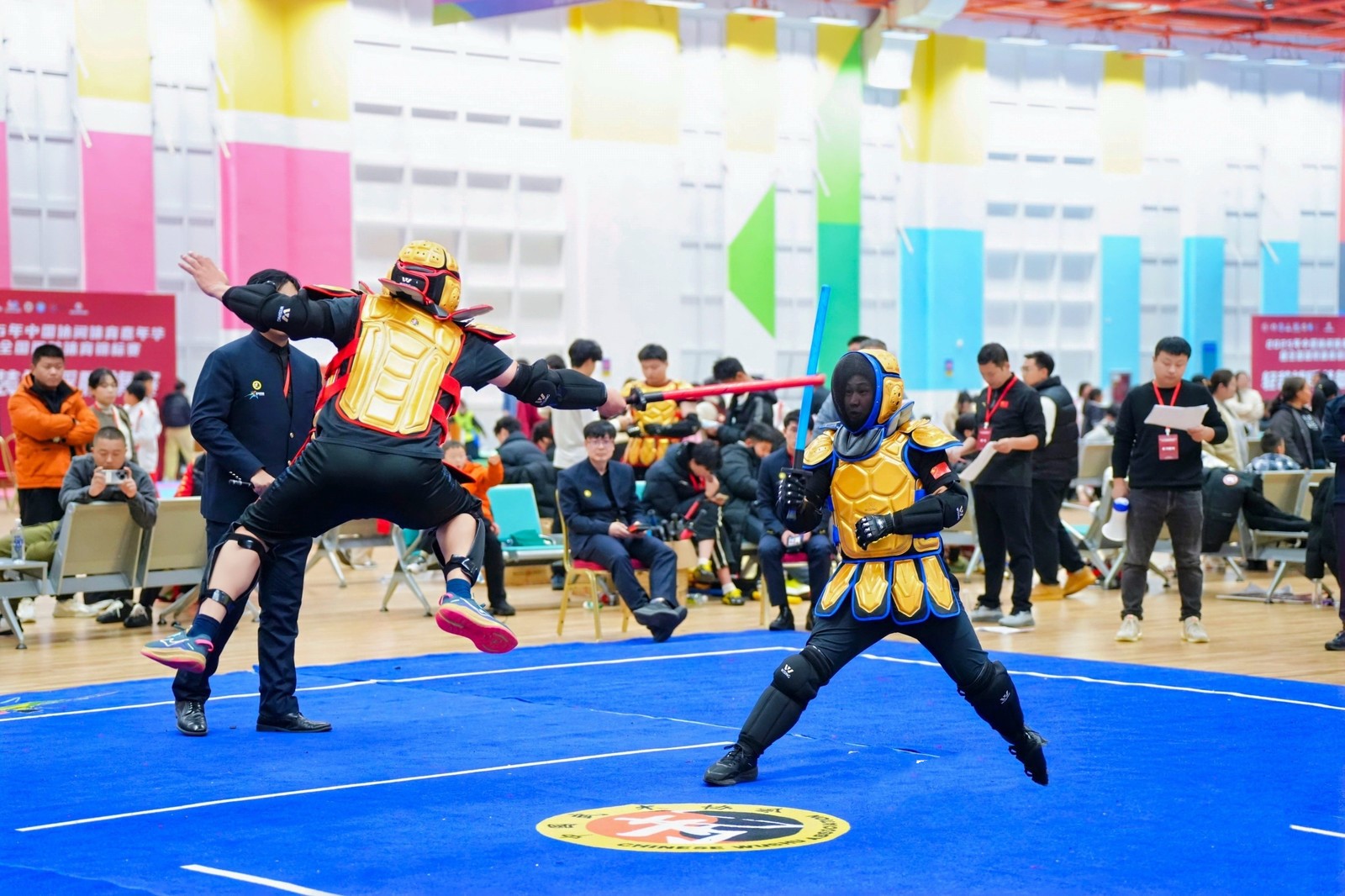 本次赛事由国家体育总局社会体育指导中心主办,为期两天,设有短兵对抗、军事擂台等多个竞赛项目,吸引了全国各省市2000余名选手同台竞技。我校高度重视此次赛事,将其作为开展国防教育、激发学生应征入伍热情的重要契机。体育学院程启平、学生处王友兵两位老师担任教练员,精心选拔并指导胡星宇、李文滔两名退役士兵学子参赛,两人分别参加了短兵对抗(个人赛)和军事擂台(个人赛)两个项目的高校组角逐。备赛期间,在教练员的科学指导下,两人针对竞赛规则和项目特点,刻苦训练、精益求精,从体能强化到技术打磨,从战术制定到心理调适,做好了全方位的准备。赛场上,面对强劲对手,我校学子沉着冷静、奋勇争先。在短兵对抗赛场,他们身法灵活、攻防有度,精准把握每一次出击时机;在军事擂台竞赛中,他们秉持着军人坚韧不拔的意志品质,严守竞赛规则,充分展现了扎实的竞技功底和良好的体育道德风尚。经过多轮激烈比拼,胡星宇凭借出色表现荣获短兵对抗高校组男子85KG+1第三名、军事搏击项目高校组男子90KG+1第二名;李文滔斩获短兵对抗高校组男子60KG第三名、军事搏击项目高校组男子59KG第三名,用实力为学校赢得了荣誉。