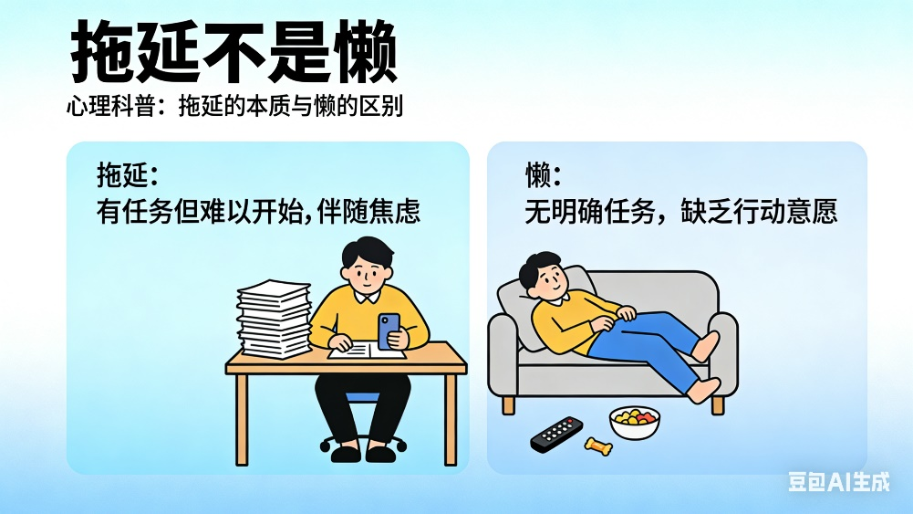 拖延是一种几乎覆盖所有人的普遍行为现象,小到作业、报告,大到人生规划、重要决策,人们都有可能出现拖延。然而,长期以来,社会对拖延的评价充满偏见与误解,最常见的标签便是:懒惰、不自律、缺乏上进心、意志力薄弱。这些简单粗暴的判断,让无数拖延者陷入深深的自我否定与情绪内耗。随着心理学研究的不断深入,人们终于认清一个核心事实:拖延不是时间管理问题,不是道德品质问题,而是典型的情绪调节问题与心理防御机制的外在表现。